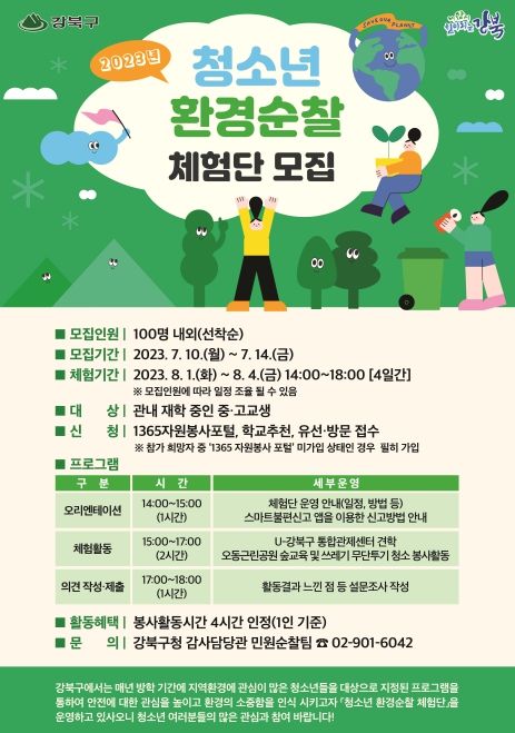 구는 체험단에 참여할 청소년 100명을 21일(금)까지 선착순으로 모집하고 있다. 지원 희망자는 1365자원봉사 홈페이지 또는 강북구 감사담당관로 방문하거나 유선으로 신청하면 된다. 환경순찰 체험은 8월 1일~4일 중 하루만 신청할 수 있다.