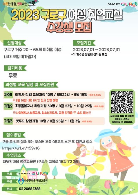 교육 대상은 취업을 희망하는 구로구 거주 20세~65세 미취업 여성 50명으로, 교육비는 무료다.