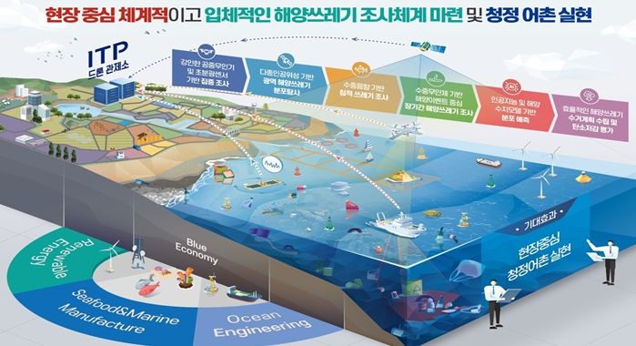 위성을 활용해 주기적으로 해양쓰레기 분포를 관측하고, 드론으로 섬(해안)과 해수면을 더욱 세밀하게 탐지한다. 바다 밑은 소나를 이용해 침적 쓰레기를 탐지해, 해안과 해수면 그리고 해저까지 해양을 오염시키는 쓰레기를 관리하는 시스템을 구축하는 것이다.