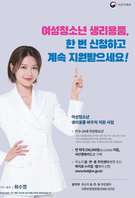 지원 대상은 '국민기초생활보장법'에 따른 생계·의료·주거·교육 급여 수급자와 법정 차상위계층, '한부모가족지원법'에 따른 지원 대상자 중 만 9세~24세 여성 청소년이다.