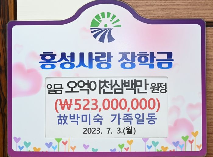 홍성군에 따르면 지난 5일 故박미숙 씨의 유지를 받들어 유족인 형제자매들이 장학사업 등 지역인재 육성을 위해 써달라며 (재)홍성사랑장학회(이사장 이용록)에 5억 2천 3백만 원을 기탁했다.