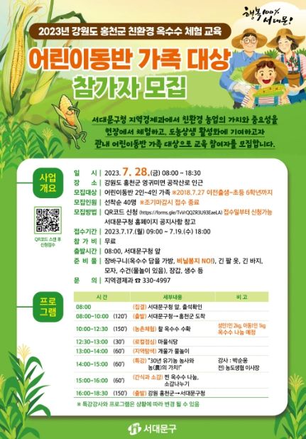 이성헌 서대문구청장은 “여름방학을 맞은 어린이들이 옥수수밭과 개울가에서 농촌의 친근함과 정겨움을 느끼는 시간이 될 것으로 기대한다”고 말했다.