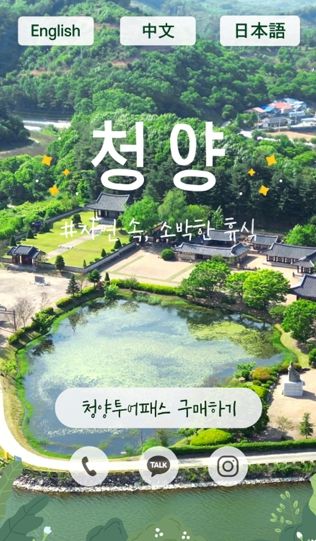 휴대전화나 컴퓨터로 접속하면 청양지역 관광지의 아름다운 풍경과 청양투어패스 구매 페이지, 청양군 관광정책팀과 전화 연결, 청양군 관광 카카오톡 채널, 청양군 관광 인스타 등 주요 정보 연결이 가능하다.