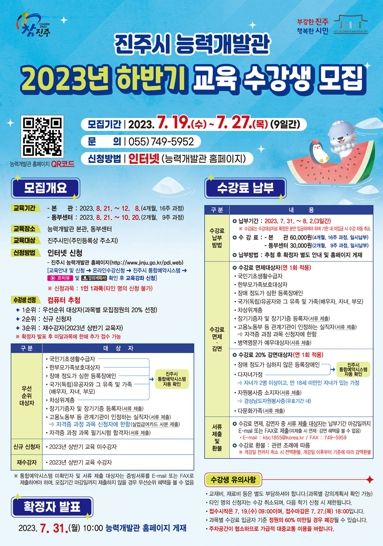 [제주교통복지신문 김강석 기자] 진주시 능력개발관은 2023년 하반기 교육 수강생을 7월 19일부터 27일까지 9일간 모집한다.
