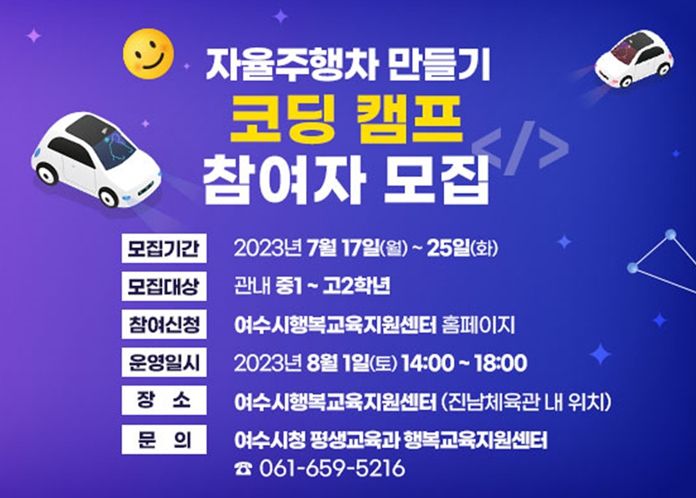 [제주교통복지신문 김강석 기자] 여수시 행복교육지원센터에서 오는 8월 1일 오후 2~6시까지 여름방학 특별 체험 프로그램 ‘자율주행차 만들기 코딩 캠프’가 열린다.