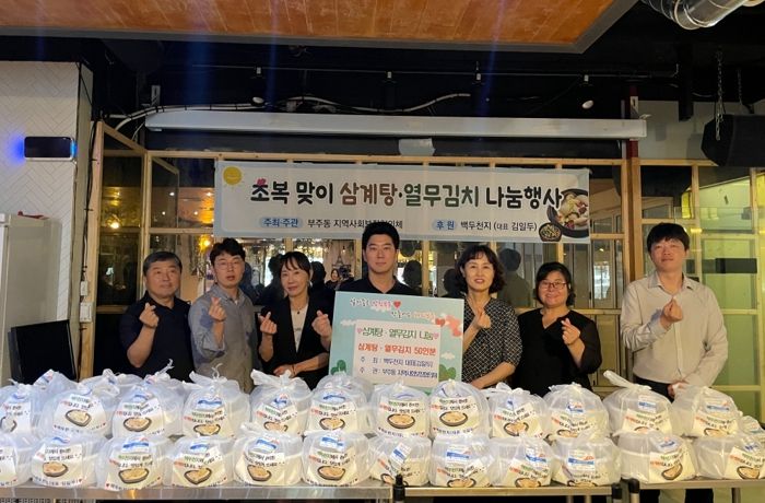 박윤희 부주동장은 “어려운 이웃에게 초복을 맞아 삼계탕과 열무김치를 후원해주신 백두천지 김일두 대표와 부주동 지역사회보장협의체 위원들에게 감사하다. 앞으로 이웃끼리 서로를 챙기고 도와주는 온정이 넘치는 부주동이 될 수 있도록 노력하겠다”고 감사의 마음을 전했다.