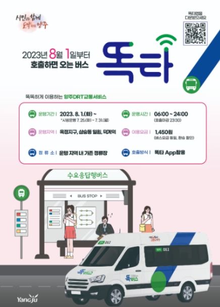 [제주교통복지신문 김강석 기자] 경기 양주시는 양주 옥정지구, 삼숭동 일원, 덕계역 구간에 시민이 부르면 오는‘똑버스’운행한다고 14일 밝혔다.