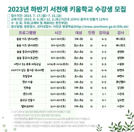 [제주교통복지신문 김강석 기자] 서천군이 오는 17일부터 21일까지 하반기 서천애 키움학교 수강생을 선착순 모집한다.