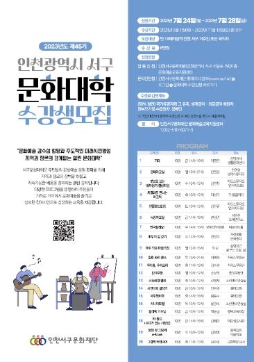 문화재단 관계자는 “문화대학이 주민곁으로 한걸음 더 다가가 서구 전 지역에서 열리는 강좌로 개편했다. 주민친화 예술교육에 많은 관심과 참여를 부탁드린다.”고 말했다.