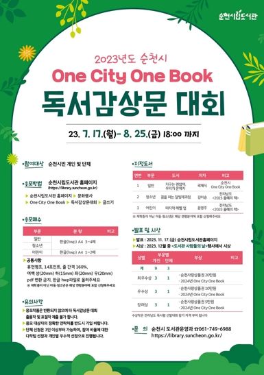 [제주교통복지신문 김강석 기자] 순천시는 순천시민 대상으로 오는 17일부터 8월 25일까지 ‘2023년 One City One Book 독서감상문 대회’를 진행한다고 밝혔다.