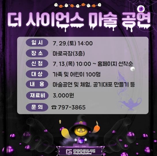 [제주교통복지신문 김강석 기자] 광양용강도서관은 오는 29일 오후 2시 여름방학을 맞이해 어린이와 가족을 위한 과학실험 마술쇼 ‘더 사이언스’를 공연한다.