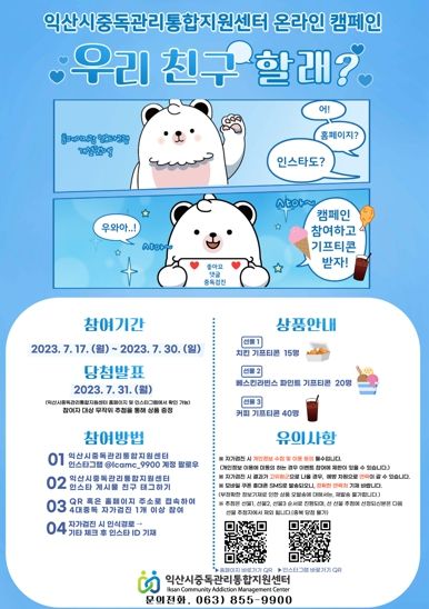 익산시민 누구나 참여 가능하며 캠페인 당첨자는 7월 31일 익산시중독관리통합지원센터 홈페이지 및 인스타그램으로 공개할 예정이다. 추첨을 통해 선정된 당첨자에게는 개별문자로 소정의 상품을 지급한다.