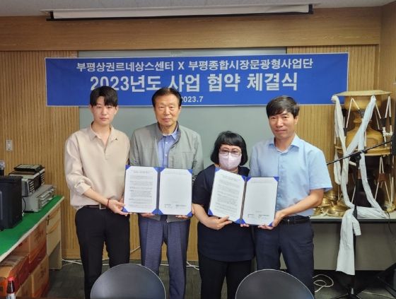 부평종합시장 고객지원센터에서 열린 이번 협약식은 부평 상권 르네상스센터 고현석 센터장, 부평종합시장 문화관광형시장 육성 사업단 김하늘 단장, 부평종합시장 윤연호 상인회장을 포함한 관계자들이 참석했다.