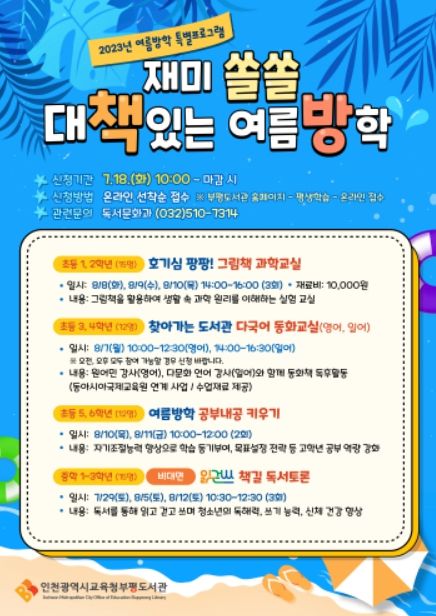 [제주교통복지신문 김강석 기자] 인천광역시교육청부평도서관은 여름방학을 맞아 초·중학생을 대상으로 자기주도 학습력과 독서력을 키우는 특별프로그램 ‘쏠쏠책방(재미쏠쏠! 대책있는 여름방학)’ 학습자를 18일 오전 10시부터 도서관 홈페이지를 통해 모집한다.