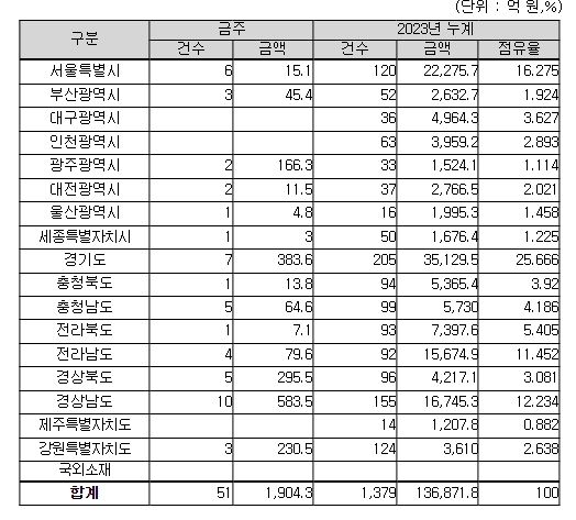 지역별로는 경상남도 584억 원, 경기도 384억 원, 경상북도 296억 원, 그 밖의 지역이 640억 원이다.