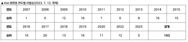 현재 개인 통산 164승 중 선발승으로 162승을 기록하고 있는 양현종은 1승을 추가하면 송진우(전 한화)가 보유하고 있는 개인 통산 선발승 163승과 타이를 이루게 된다.