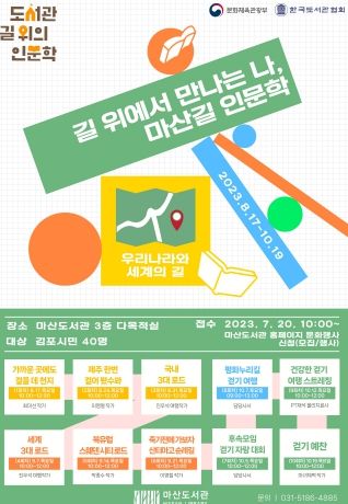 [제주교통복지신문 김강석 기자] 김포시 마산도서관은 문화체육관광부가 주최하고 한국도서관협회가 주관하는 ‘공공도서관 길 위의 인문학’ 공모사업에 2022년에 이어 2년 연속 사업에 선정됐다. 이에 오는 8월 17일부터 10월 19일까지 마산도서관 3층 다목적실에서 ‘길 위에서 만나는 나, 마산길 여행 인문학’을 운영한다.