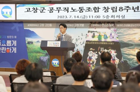 심덕섭 고창군수는 “고창군 공무직노동조합 창립 8주년을 축하하고, 군민을 위해 더욱더 노력하는 노동조합이 되기를 바란다”며 “군민 모두가 행복한 활력 넘치는 고창시대를 만들어가기 위해 노사가 서로 화합하고 협력하길 당부드린다”며 축하했다.