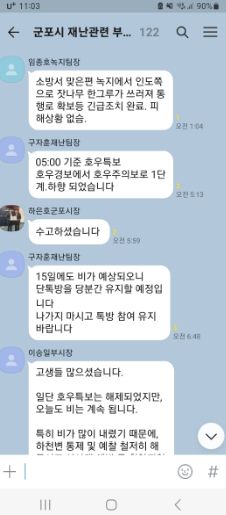 14일 새벽 5시 재난팀은 호우경보에서 주의보로 1단계 낮아졌다고 알렸다. 하지만 15일에도 비가 예상되니 단톡방을 유지하겠다고 알렸다. 하은호 시장은 ‘수고하셨다’고 올렸다. 부시장은 비가 계속되고 있으니 하천변 등 취약지역관리를 당부했다.