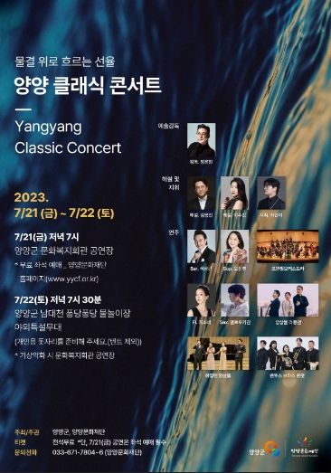 [제주교통복지신문 김강석 기자] (재)양양문화재단이 주최하고 양양군이 후원하는 “2023 양양 클래식 콘서트-물결 위로 흐르는 선율” 공연을 오는 7월 21일, 22일 2일간, ‘양양문화복지회관 공연장’과 ‘양양 남대천 퐁당퐁당물놀이장 야외특설무대’에서 개최한다.