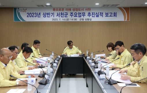 군은 14일 군청 상황실에서 김기웅 서천군수와 부군수를 비롯한 부서장 등 공직자 30여명이 참석한 가운데 2023년 주요업무 추진실적 보고회를 개최했다.
