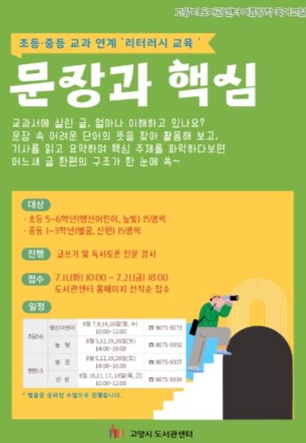 [제주교통복지신문 김강석 기자] 고양특례시는 4개 도서관(신원, 별꿈, 높빛, 행신어린이)에서 오는 8월 5일부터 8월 26일까지 여름방학 기간 동안 초등 5~6학년과 중등 1~3학년을 대상으로 2023 교과연계 문해력 교육 ‘문장과 핵심’을 운영한다.