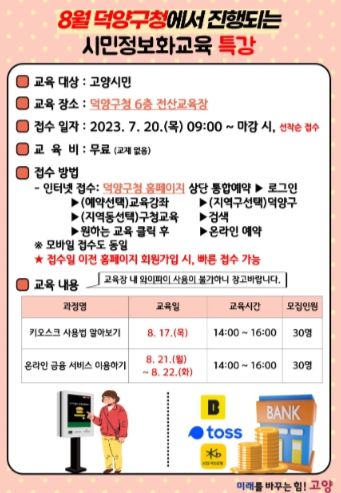 정보화교육 담당자는 “8월에 진행되는 특강은 정규 교육 과정 외 덕양구에서 시민들을 위해 준비한 특별한 과정이다. 이번 교육은 온라인 시대에 발맞춰 키오스크 사용법과 디지털 금융앱 사용을 익히고, 디지털 범죄를 예방하는 방법을 다루고 있으니, 많은 관심과 참여 부탁드린다.”라고 전했다.