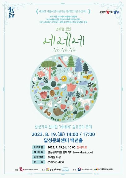 만 36개월 이상 관람가인 이번 공연은 전석 무료로 진행되며 7월 19일 오전 10시부터 달성문화재단 홈페이지를 통해 1인 최대 4매까지 선착순으로 예매할 수 있다. 기타 자세한 사항은 달성문화재단 문화사업팀으로 문의하면 된다.