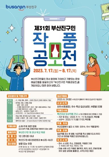 [제주교통복지신문 김강석 기자] 부산 부산진구에서는 부산진구민들의 정서 함양에 기여하고 기량 있는 문화예술인을 발굴하기 위해 ‘제31회 부산진구민 작품공모전’을 개최한다고 밝혔다.