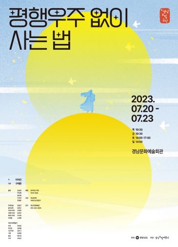 경남도립극단의 7월 정기공연 ‘평행우주 없이 사는 법’은 경남문화예술회관 대공연장에서 7월 20일 19시 30분, 21일 19시 30분, 22일 14시·17시, 23일 14시, 4일 5회 공연 예정이며, 예매는 인터파크를 통해 가능하다.