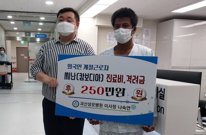 씨난 씨는 “병원비로 인해 맘고생이 심했는데 병원에서 치료비 지원뿐만 아니라 병원치료로 일하지 못한 기간까지 배려해 생각지 못한 위로금까지 전달받게 되어 꿈만 같다”라며 여러모로 힘써 주신 괴산군과 괴산성모병원에 감사함을 전했다.
