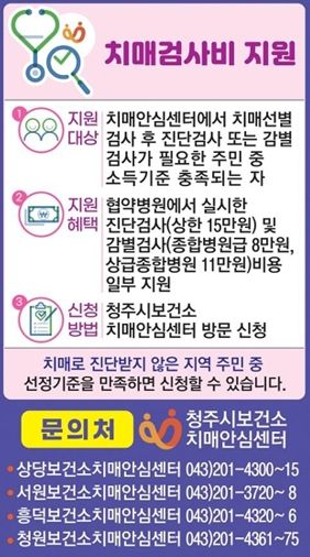 신청은 청주시 4개 보건소 치매안심센터로 본인 신분증을 지참해 방문하면 된다.