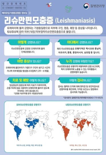 제4급 법정감염병인 해외유입 기생충증에 해당하는 리슈만편모충증은 감염될 경우 피부 노출부의 구진, 수포, 결절 및 궤양 증상이 나타나고 감염부위에 광범위한 흉터가 생기는 등 장기간 피부 이상을 초래할 수 있다.