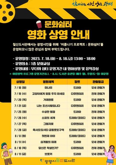 [제주교통복지신문 김강석 기자] 광명시가 공공도서관을 무더위 쉼터로 지정하고 영화 상영 및 다양한 프로그램을 통해 문화생활을 지원한다.