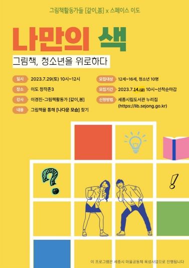 [제주교통복지신문 김강석 기자] 세종시립도서관이 지난 14일부터 청소년 그림책 프로그램 ‘나만의 색’에 참여할 청소년을 선착순 모집 중이라고 16일 밝혔다.