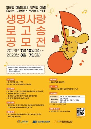 [제주교통복지신문 김강석 기자] 충남도와 충남광역정신건강복지센터는 다음달 7일까지 한 달간 생명사랑 로고송 공모전을 진행한다고 16일 밝혔다.
