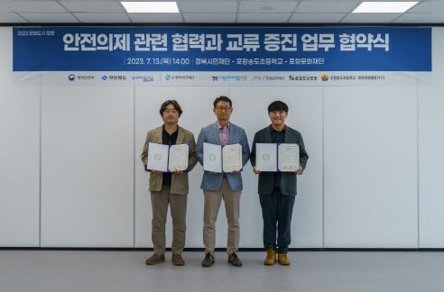 현재 우리 사회 담론의 주요 테마 중 하나인 ‘안전’을 주제로 하는 이번 협약식은 안전과 관련된 활동에서 포항지역이 가지는 상징성을 바탕으로 재난피해 극복과 안전도시로서 지향점을 나타내고자 포항문화재단, 경북시민재단, 포항송도초등학교, 문화재생활동가 F5 관계자 등이 참석한 가운데 진행됐다.
