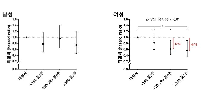 반면, 남성의 경우 신체활동과 우울증 발생에 유의한 상관관계는 관찰되지 않았다.