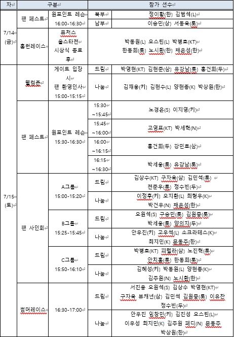오후 4시 30분에는 그라운드에서 ‘신한은행 SOL 썸머레이스’가 열린다. 팬들이 드림의 SSG 서진용, 오원석, KT 김상수, 박영현, 삼성 구자욱, 뷰캐넌, 롯데 김민석, 김원중, 두산 이유찬, 정수빈, 나눔의 키움 안우진, 임창민, LG 김진성, 오스틴, KIA 이우성, 최지민, NC 김주원, 페디, 한화 문동주, 박상원과 팀을 이뤄 장애물 달리기 경주를 펼친다. 대회는 토너먼트로 진행되며 우승 팀에게는 상금 350만원이 주어진다.