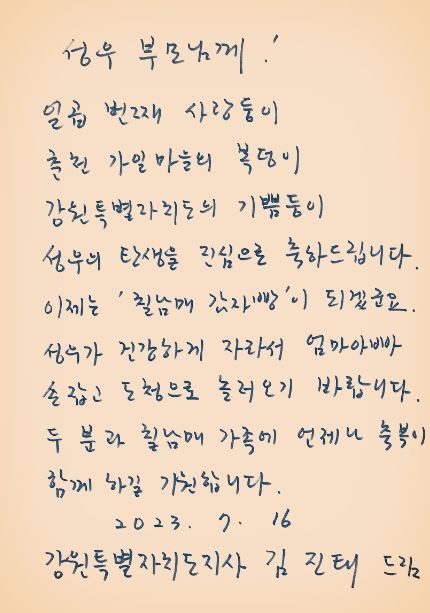 김진태 지사는 편지에서 “일곱번째 사랑둥이, 춘천 가일마을의 복덩이, 강원특별자치도의 기쁨둥이, 성우의 탄생을 진심으로 축하드린다”라고 전하며, “성우가 건강하게 자라서 엄마, 아빠 손 잡고 도청으로 놀러오길 바란다”라며 부부와 7남매 가족에 축복을 기원했다.
