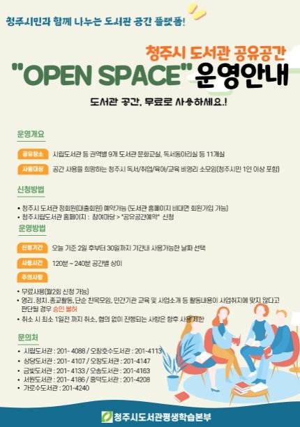 [제주교통복지신문 김강석 기자] 청주시립도서관은 도서관 공간을 시민에게 무료로 빌려주는 공유공간 서비스 ‘OPEN SPACE’를 운영한다고 17일 밝혔다.