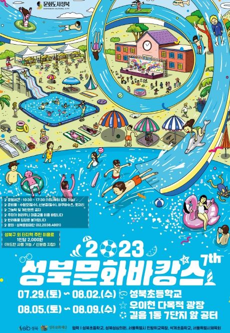 7회째를 맞이해 운영 장소가 확대되는 성북문화바캉스는 기상 상황에 따라 개장 상황이 달라질 수 있는 만큼 성북문화재단 누리집 또는 전화를 통해 세부 정보를 확인하는 것이 좋다.