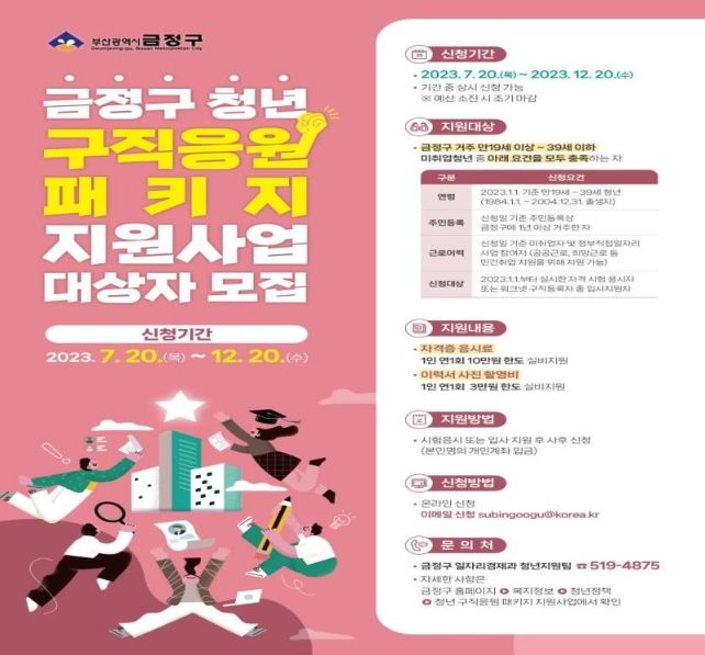 [제주교통복지신문 김강석 기자] 부산 금정구는 청년의 실질적 자립 기반 형성 및 사회참여 역량 강화를 위한‘2023 금정구 청년 구직응원 패키지 지원사업’을 본격적으로 추진한다고 밝혔다.