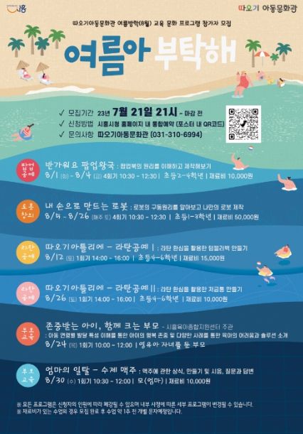 시 관계자는 “즐겁고 신나는 여름방학을 맞아 지역 주민들을 위해 풍성한 교육프로그램을 준비했다. 무더운 여름, 시원한 따오기아동문화관에서 다양한 문화 경험의 기회를 통한 특별한 추억을 만들어보시길 바란다”라고 덧붙였다.