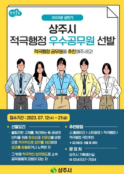 [제주교통복지신문 김강석 기자] 상주시는 유연하고 창의적인 공직문화를 조성하고 적극행정을 장려하기 위해 2023년 상반기 적극행정 우수공무원(총 6명-최우수1, 우수2, 장려3)을 선발한다고 밝혔다.