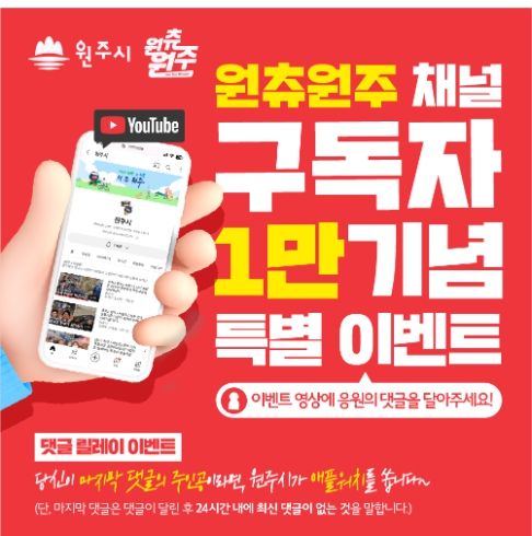 원주시는 구독자 1만 명 돌파를 기념하여 댓글 릴레이 이벤트를 진행하고 있으며 16일 현재 486개의 응원 댓글이 달리는 등 시청자들의 뜨거운 반응을 불러일으키고 있다.