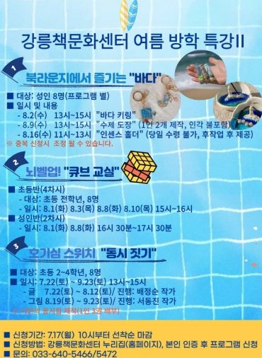 여름방학 특강 프로그램 Ⅱ는 17일(월) 오전 10시부터 선착순으로 모집하고 자세한 내용 및 신청은 강릉책문화센터 누리집을 참고하면 된다.