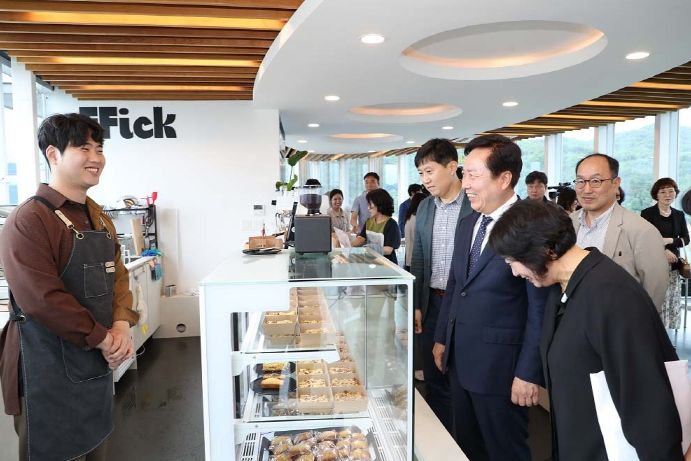 △ 지난 5월, 안동댐 세계물포럼 기념센터 전망카페를 초기 자본과 경험이 부족한 청년 창업가의 테스트베드 공간으로 새롭게 오픈했다. 안동시와 K-water, 안동형 일자리사업단은 지난해 개최된 BETA 페스티벌 2022 카페창업 경진대회에서 선발된 청년 예비창업가에게 1년간 카페를 운영해 볼 수 있는 기회를 제공했다. 전망카페의 첫 창업자가 된 김기현 씨는 ‘포크(Fork)와 핑거(Finger)푸드를 즐기는 디저트 공간’이라는 뜻인 픽(FFICK) 카페를 개업하여 운영하고 있다.