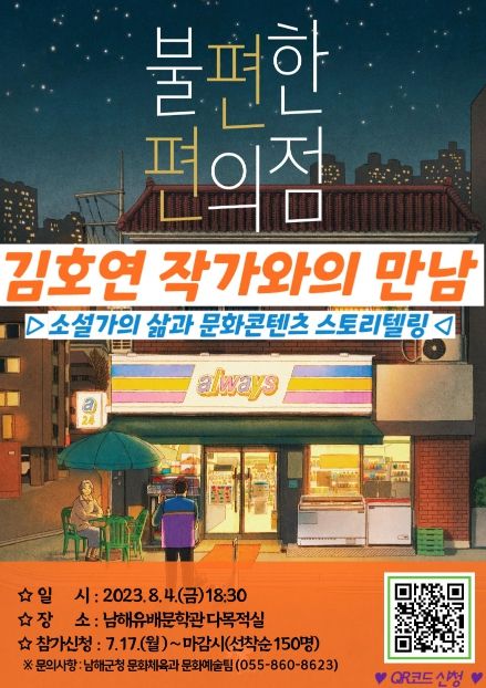 참가희망자는 7월 17일부터 남해군청 누리집 새소식에서 QR코드를 통해 신청서를 제출하면 되고, 선착순 150명에 한해 입장이 가능하다. 그리고 신청자 중선착순 40명은 당일 작가 사인회도 참석할 수 있다.