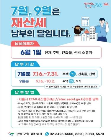 [제주교통복지신문 김강석 기자] 강동구는 2023년도 7월 정기분 재산세 21만 3천309건, 335억 원을 부과했다고 밝혔다.